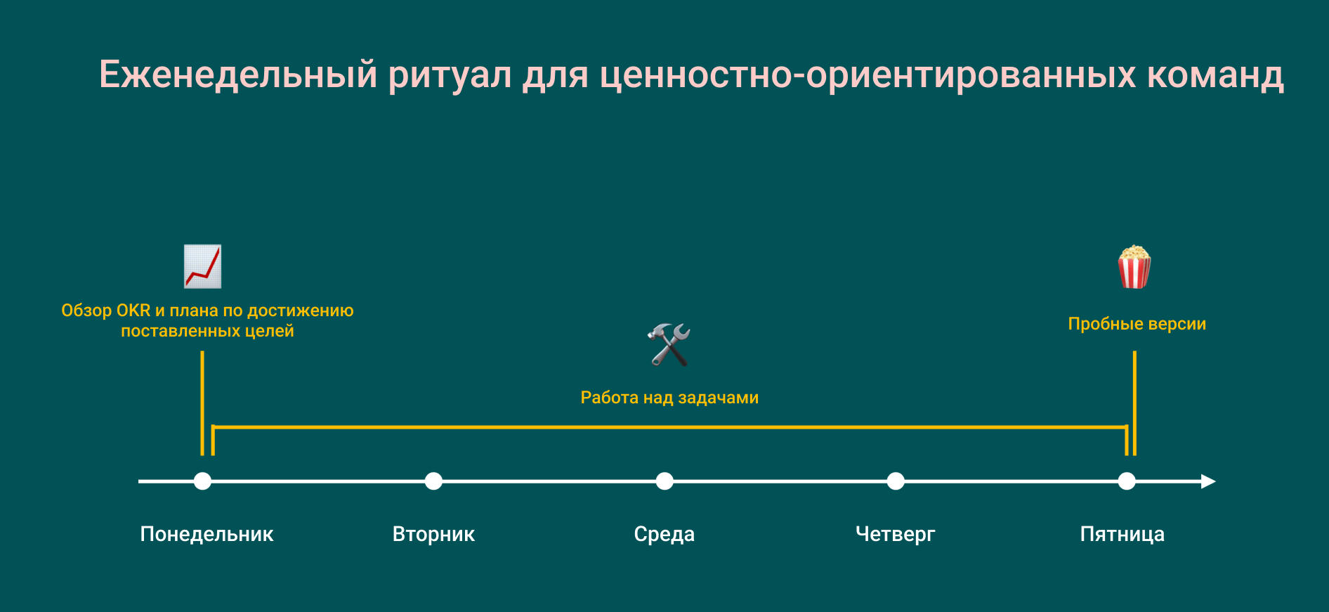 Этот еженедельный ритуал очень важен для работы OKR в Потоке. Это поможет всем помнить о правильном контексте при принятии проектных решений. Это также простой способ создать естественную ответственность и улучшить согласованность (повторение работает!).