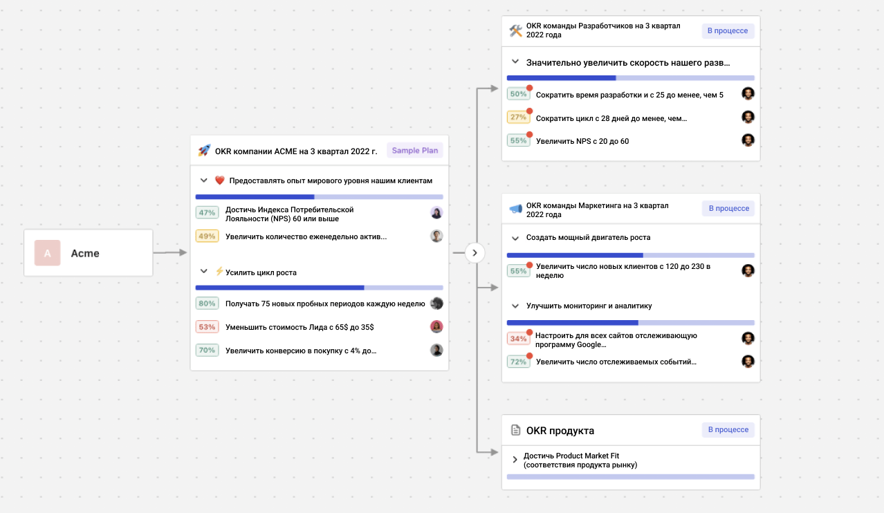 Каскадное согласование (сверху-вниз/от топ-менеджмента до команд и сотрудников) OKR было популярным подходом несколько лет назад. Но в последние годы многие, в том числе и мы, выступили против этого подхода. Мы рекомендуем более гибкую модель, в которой команды могут создавать свои планы под контролем руководителя, не навязывая свои цели. Позже они могут решить, какие элементы сопоставлять с outcome руководителя.