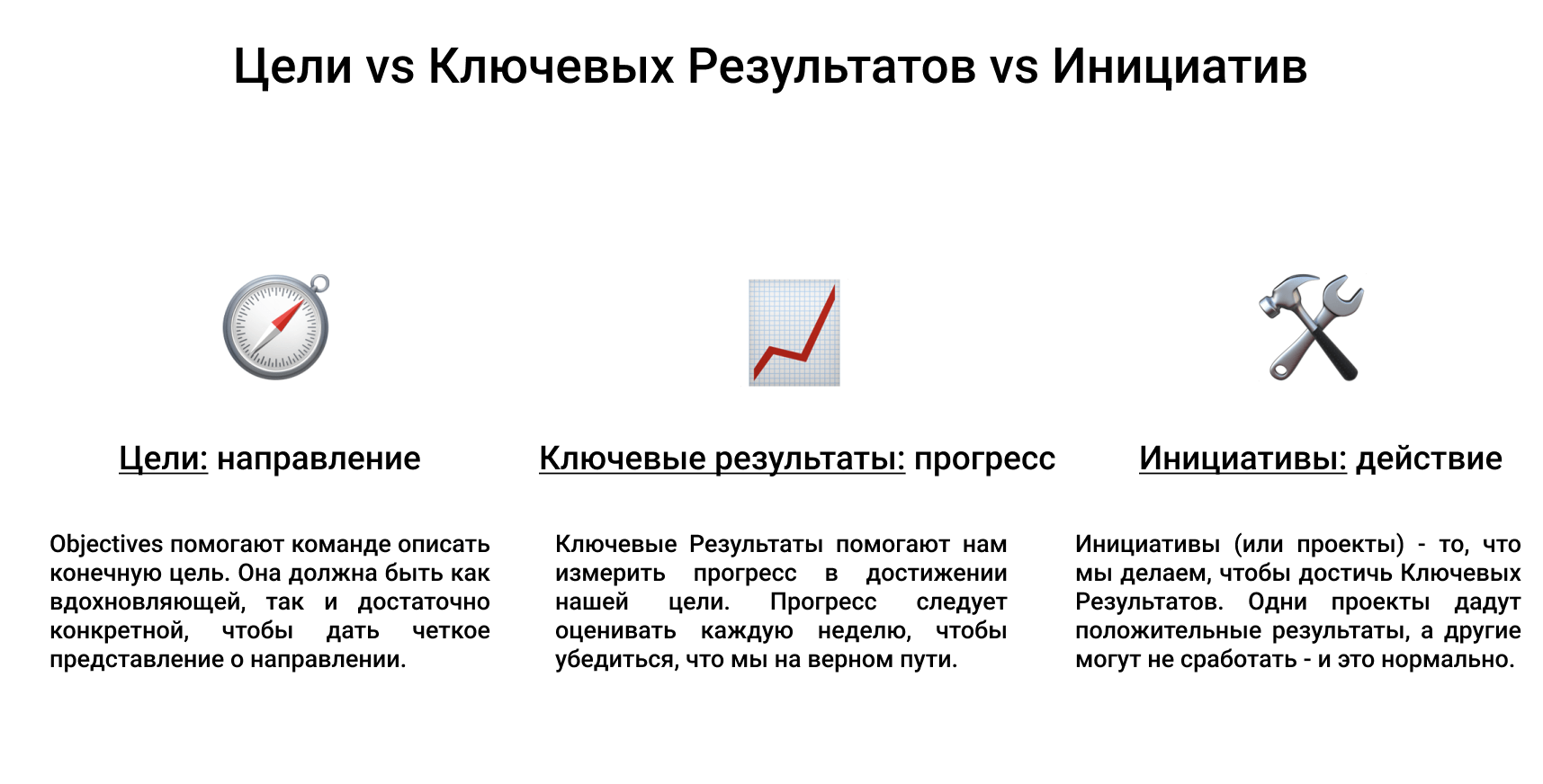 #1. Понимание роли OKR и роли ИнициативВ моделе OKR в Потоке мы используем точный набор определений для Целей, Ключевых Результатов и Инициатив.