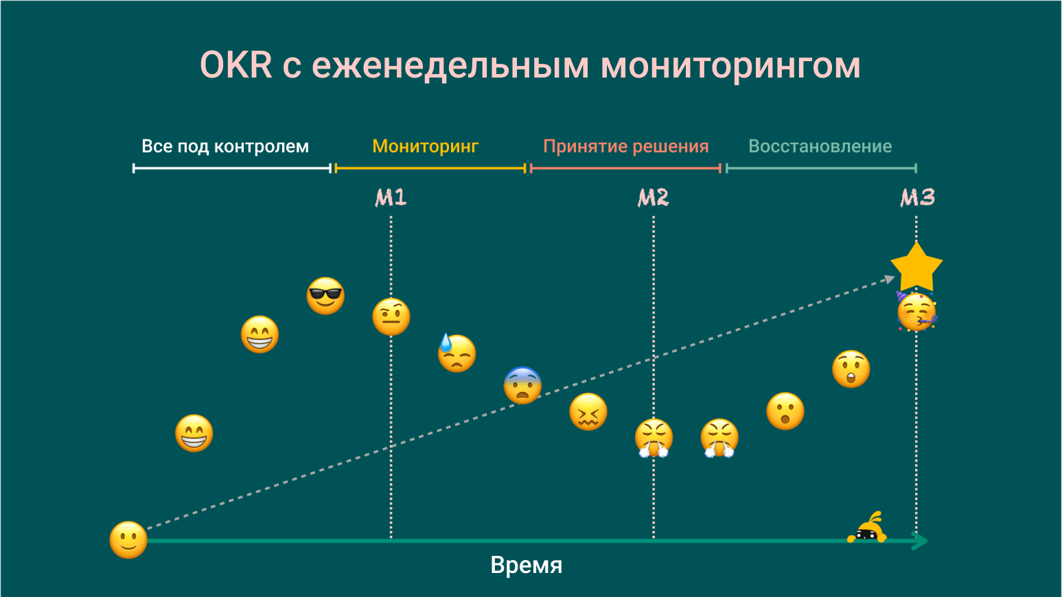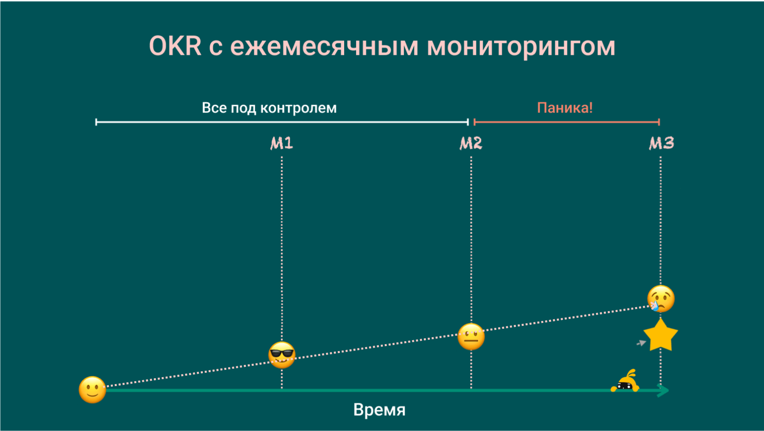 Команды, которые ежемесячно мониторят OKR, могут поддаваться ложному чувству безопасности до второго месяца. И тогда будет уже слишком поздно, если вы не приступали к достижению Целей и Ключевых Результатов.