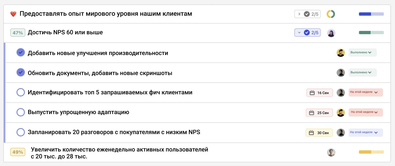 Еженедельный обзор OKR — подходящее время для обзора прогресса по усилиям, которые делает команда. Некоторые из ваших инициатив окажут положительное влияние на OKR, а часть работы не даст ожидаемых результатов.
