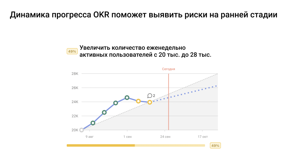 - Желтый = риск (есть риск, что мы не достигнем цели до конца, но прогресс по ней будет - прим. ред.)