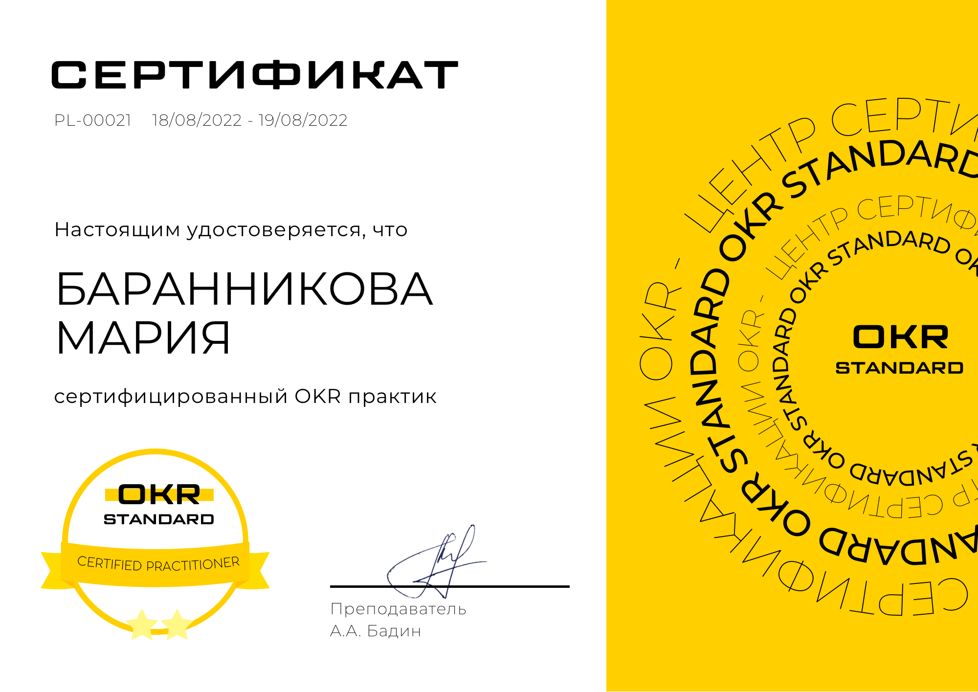 - сертификат, подтверждающий навыки OKR практика - OKR Certified Practitioner