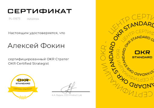 - сертификат, подтверждающий навыки OKR практика - OKR Certified Practitioner