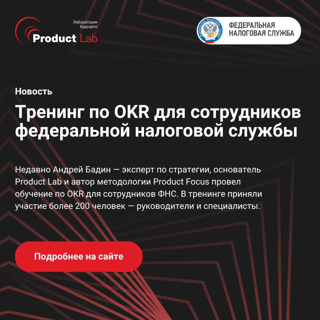 Недавно Андрей Бадин — эксперт по стратегии, основатель Product Lab и автор методологии Product Focus провел обучение по OKR для сотрудников ФНС. В тренинге приняли участие более 200 человек — руководители и специалисты. Главная цель обучения — познакомить участников с системой OKR и показать, как его можно применить на практике.