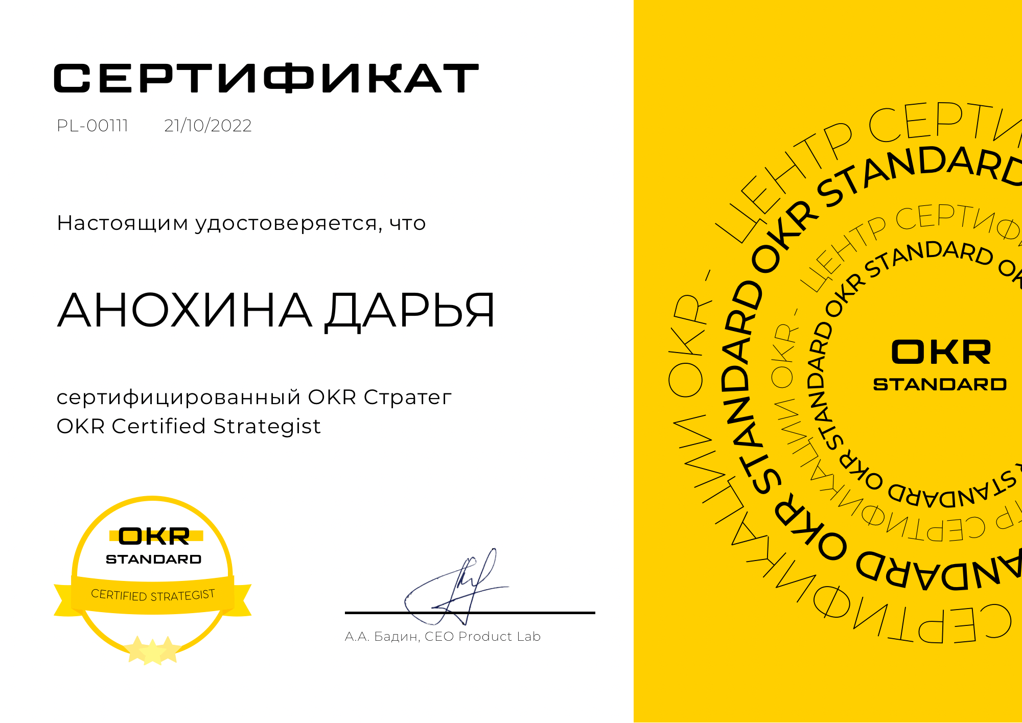 Благодаря тренингу OKR Certified Strategist ваша команда сможет приступить к внедрению OKR и сделать корпоративную культуру более гибкой, а также получит сертификат подтверждающий практические навыки сотрудников в применении OKR!